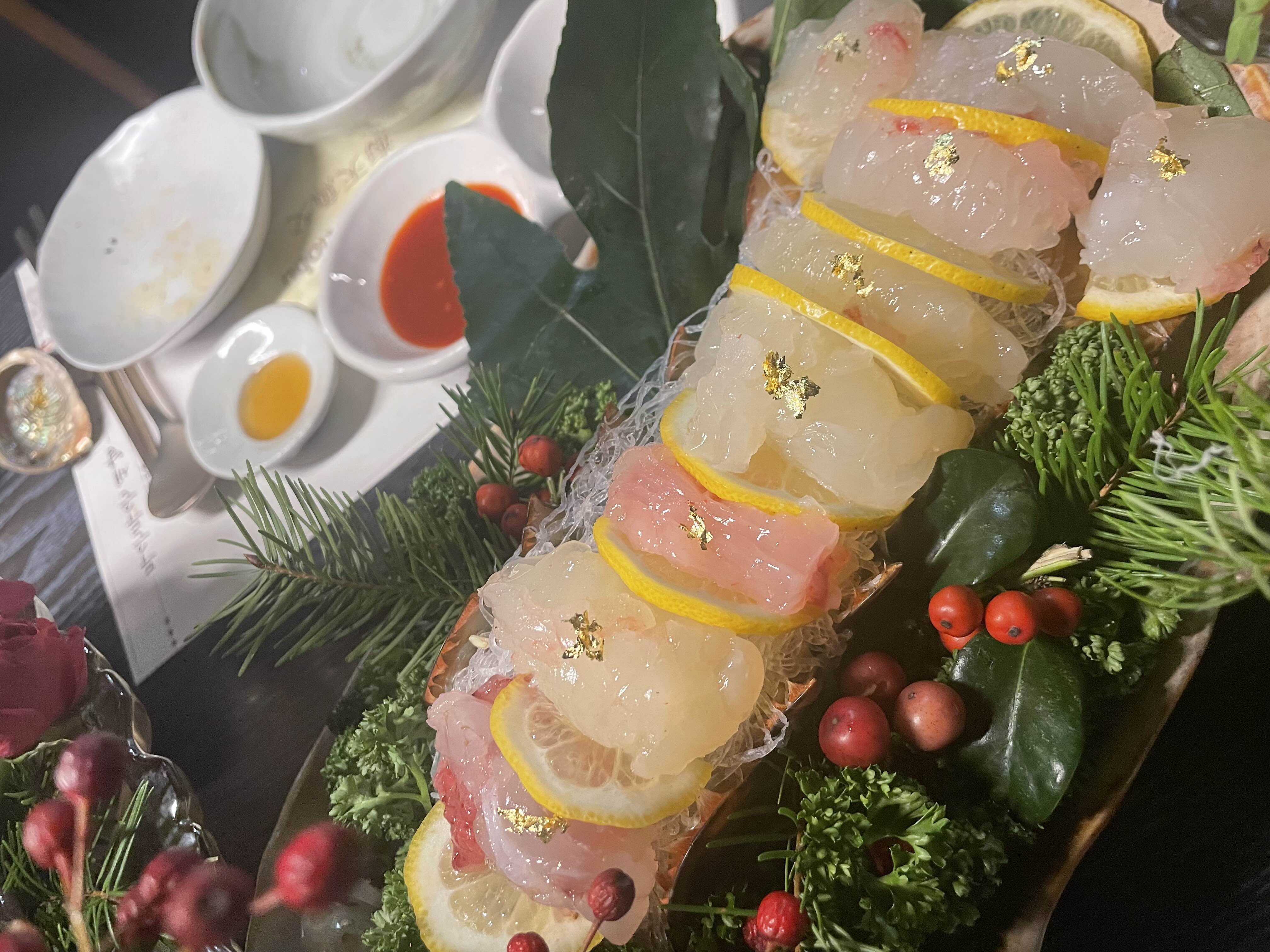 한 껏 텐션을 끌어올리고, 대망의 꼬리 회가 나옵니다. 크리스마스라서 더더욱 데코에 한껏 신경쓴 플레이팅 ! ! ! !